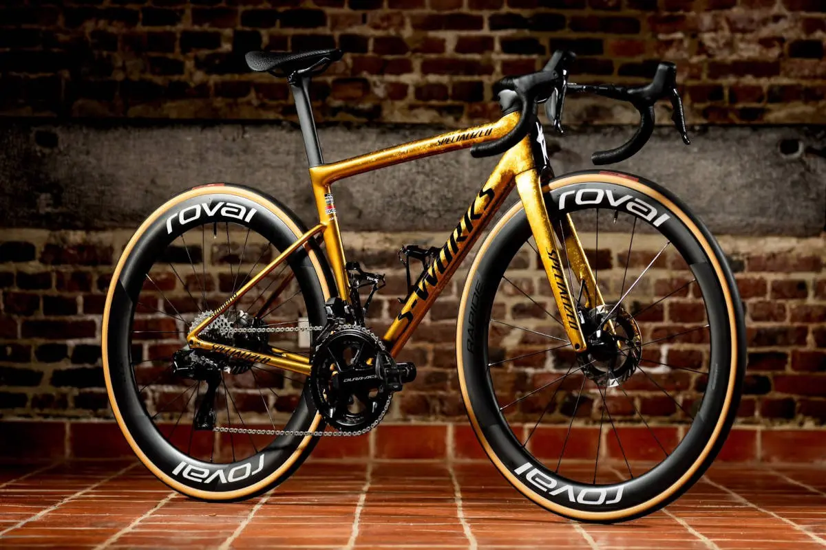 Remco Evenepoel ha mostrado su nueva Specialized S-Works Tarmac SL8 para la temporada 2026. La bicicleta tiene detalles dorados que celebran su título de campeón olímpico de ruta y contrarreloj en los Juegos de París 2024.
